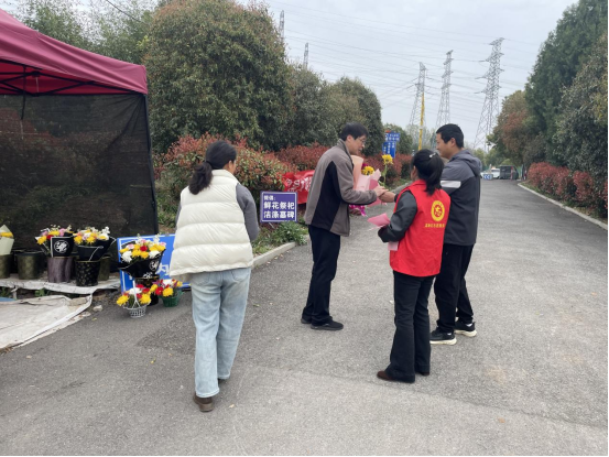 活动现场设置文明祭扫宣传台,志愿者向祭扫群众免费发放鲜花与文明祭扫倡议书,耐心劝导群众摒弃焚烧纸钱、燃放鞭炮等陋习,讲解相关安全与环保危害,积极倡导厚养薄葬、绿色文明祭扫理念。