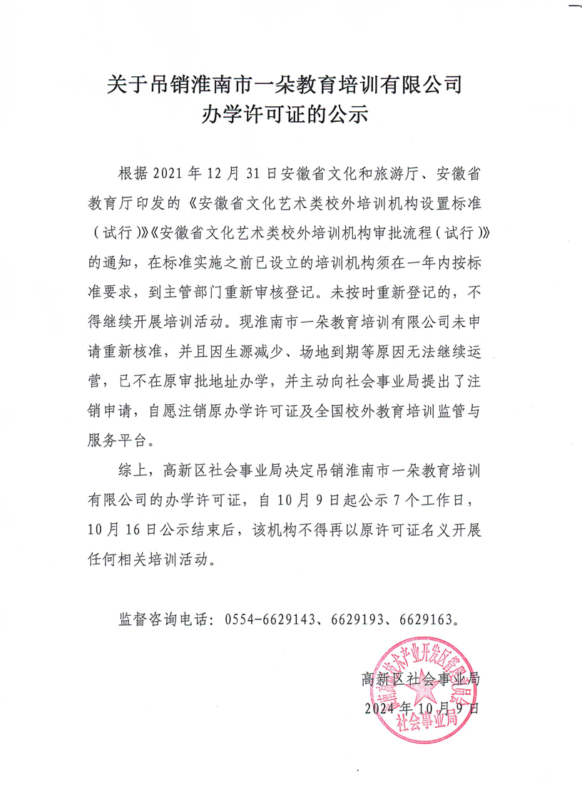 关于吊销淮南市一朵教育培训有限公司办学许可证的公示