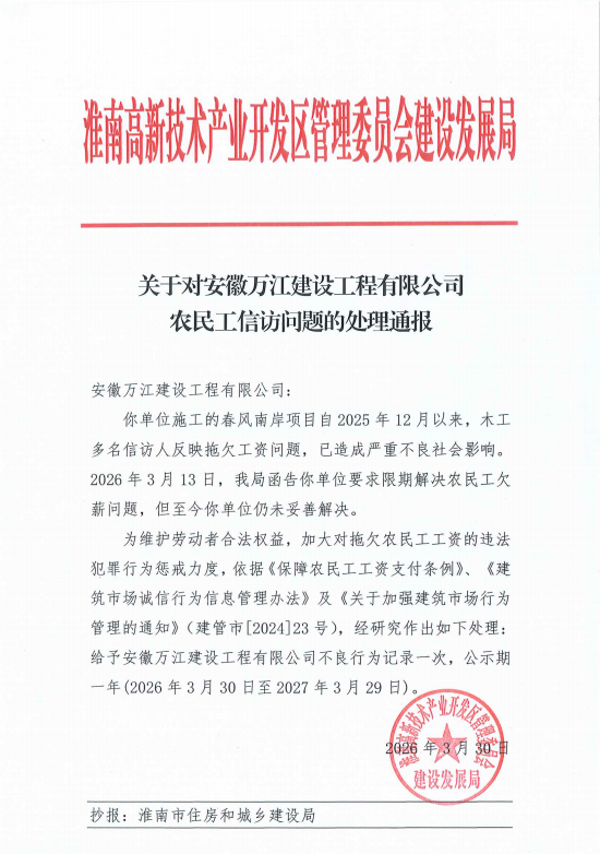 关于对安徽万江建设工程有限公司农民工信访问题的处理通报