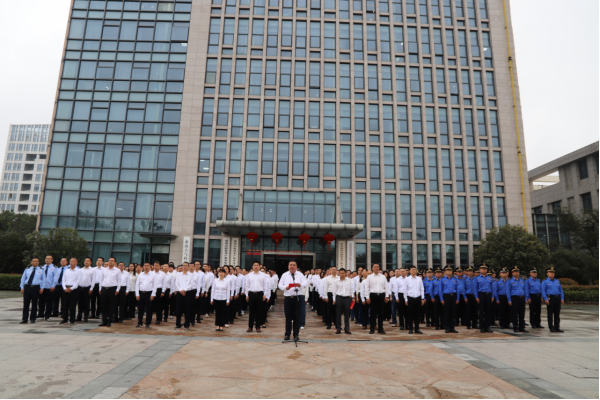 仪式开始,国旗护卫队迈着铿锵有力的步伐护送国旗入场。在雄壮的国歌声中,鲜艳的五星红旗冉冉升起,全体干部职工肃立行注目礼,齐声高唱国歌。
